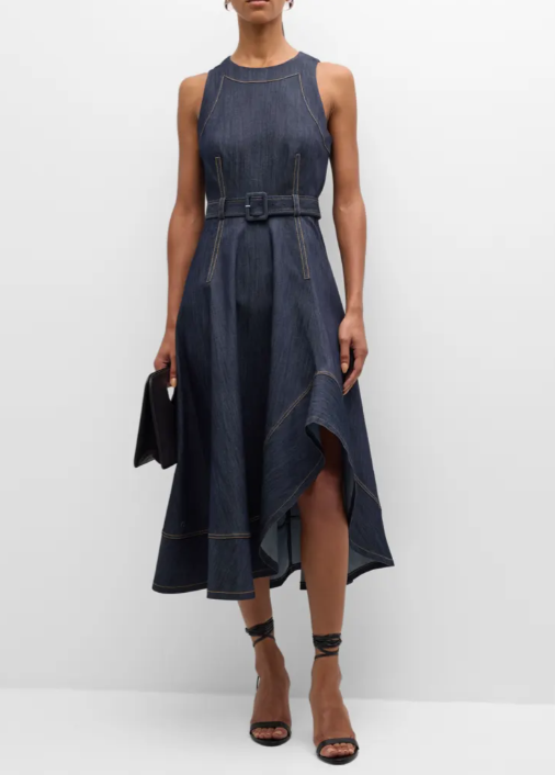 A modern, sleeveless denim midi dress featuring an asymmetric hem, belted waist, and tailored details that blend casual cool with elevated style.