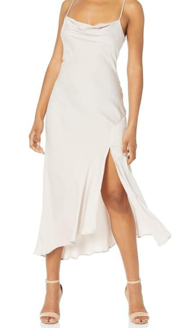 Make your special occasion memorable with the Gaia Midi. Starting with a sexy cowl neckline, this silhouette continues down to a relaxed bodice and asymmetrical skirt. Front slit accent and cross strap back make this dress your choice for a romantic occasion.