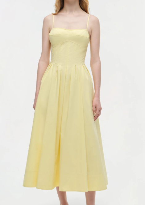Crafted from crisp cotton poplin, this dress captures the essence of spring elegance featuring a fitted bodice, a graceful A-line skirt, and a demure mid-calf length.